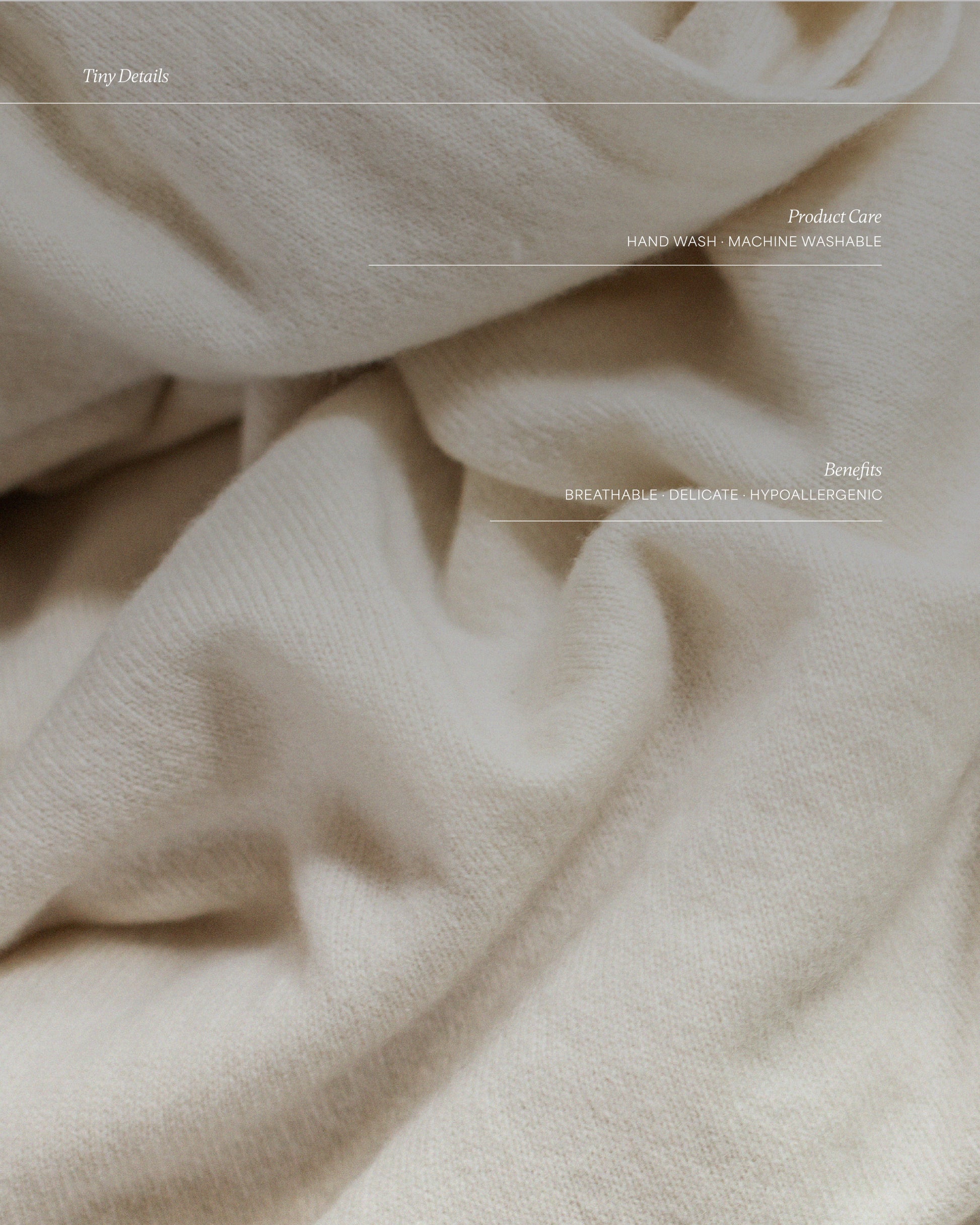 Crafted from a soft, warm, subtly textured cashmere in white. Our origins trace back to Kashmir, where the story of Cashmere began. The fabric is brought to life in Italy with one of the world’s finest mills, renowned for high-end textiles, before being woven into blankets by skilled artisans along the old Silk Road of Turkey.